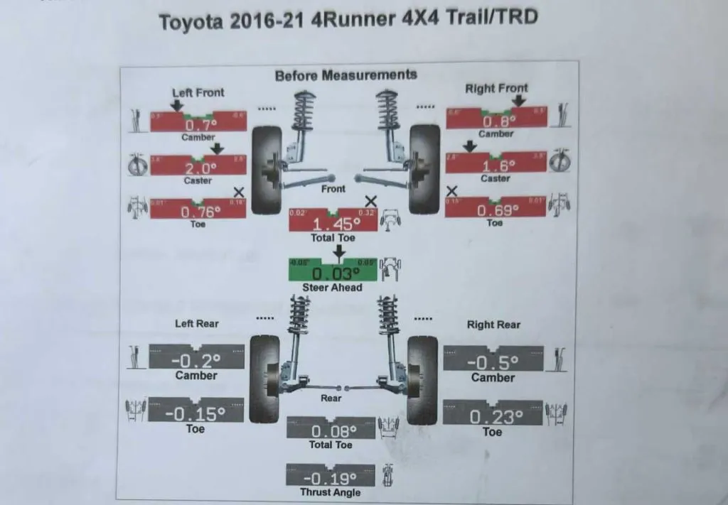 Before driving too much, I knew an alignment was critical. Whenever you adjust the suspension ride height, you’ll alter your alignment settings (camber, caster, and toe). I immediately took the 4Runner in for a professional alignment, and this is where I encountered a couple of surprises worth sharing.